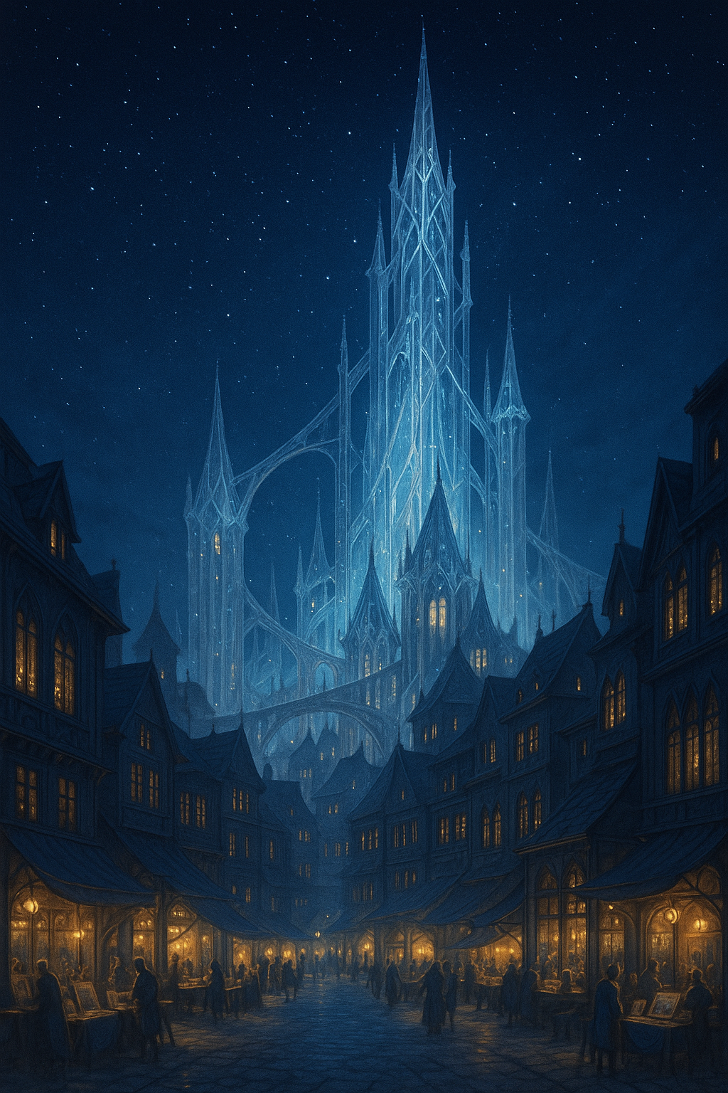 When dusk falls, the city exhales. Rune-lanterns bloom across its high bridges, casting stars upon the cobbles. Artists set up canvas stalls in temple gardens, coffee houses fill with murmured theory and stringed music, and charm-crafters leave flickering sigils of their wares trailing in the air like scent. The magic that by day watches and weighs, by night sings and sways.