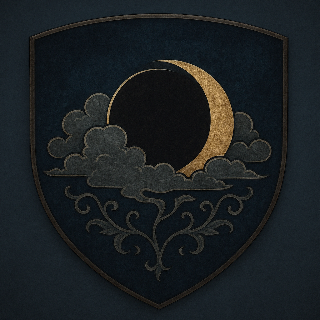 Symbol/Colours: A silver eclipse veiled by swirling clouds, set against a field of midnight blue and shadow-black, with accents of ash-grey.