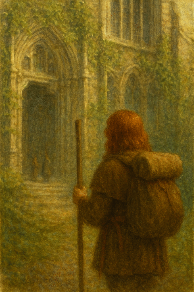 The light slants low when Lowen arrives at the door—less sun than haze, soft like river breath. The wind’s gone thin, scented faintly with dry bark and old petals. They pause, one hand raised, then knock twice against the carved frame.