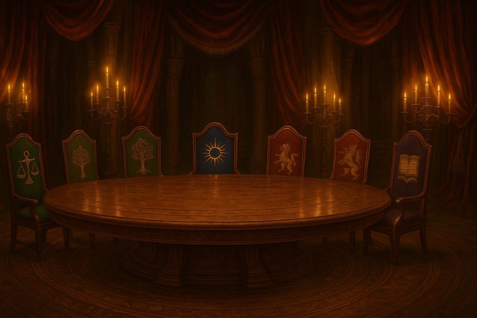 Motto: “Truth Wears a Thousand Masks.”Domain: Espionage, Secrets, ManipulationSymbol/Colours: A silver eclipse veiled by swirling clouds, set against a field of midnight blue and shadow-black, with accents of ash-grey. Master of Whispers: Siran Dravenor Overview When words fail and swords fall silent, it is secrets that change the course of the Evergild. House of Whispers…