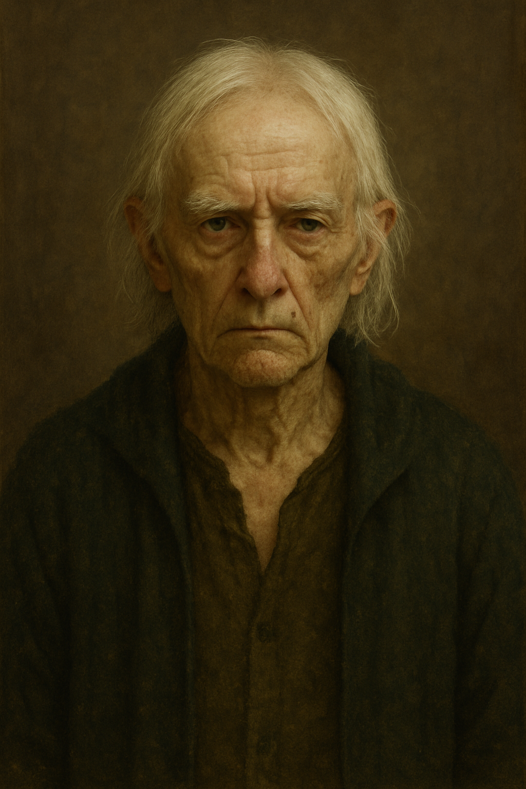 Thin and drawn, with lank, chin-length hair that hangs damp with the weather or sweat, he carries the smell of dried leaves and something slightly metallic. His sallow skin is mottled with liver spots, and one dark mole near his cheek stands out like a smudge. One of his eyes is clouded and pale—the other sharp, too sharp.