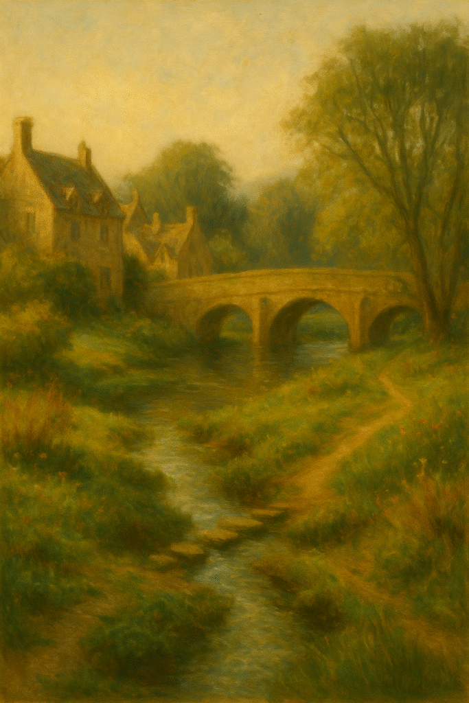 Its slate-roofed buildings cluster beside a shallow river, crossed by a long stone bridge arched with age. A clear-banked stream wends its way through Mellwain’s outer fields, threading between herb gardens and orchard plots before folding quietly into the river.
