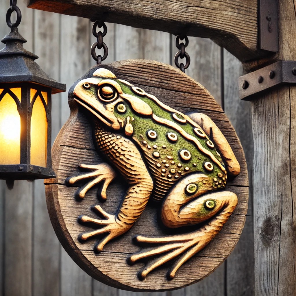 The sign shows a toad crouched beneath a hanging lantern, with soft golden light glinting off the paint when it catches the rain.