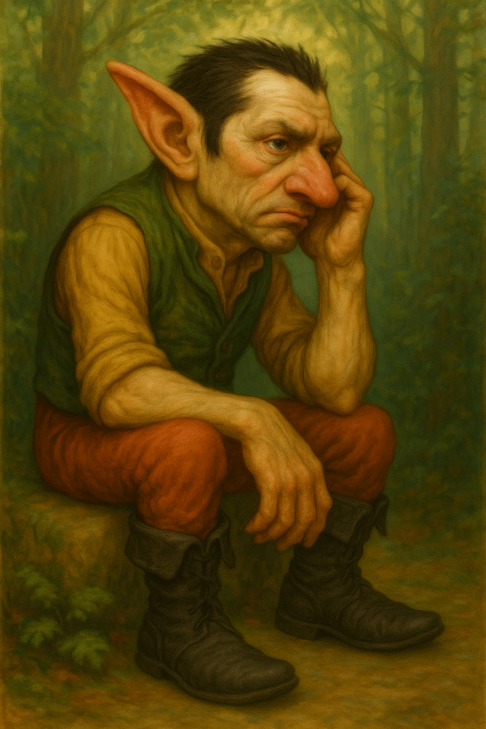 Gravelboot stands twelve inches tall, dressed in a mossy green waistcoat, burgundy trousers, and a mustard linen shirt with the sleeves rolled and buttoned. His face is lined but not old. His boots are heavy, and after witnessing suffering, he often stops to shake one out, grimacing. This is where he gets his name.
