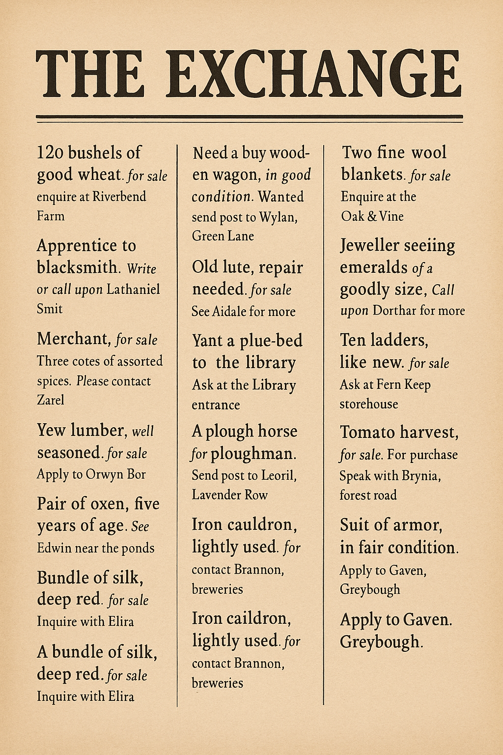 Originally a humble ledger for goods, services, and travel notices, The Exchange began as a practical community resource pinned in folk inns and village halls. It included listings for livestock trades, requests for weather omens, and odd jobs — but somewhere between second-hand boots and offers of cider-making, the heartsick began to post. The transition was subtle. A note here. A poem there.