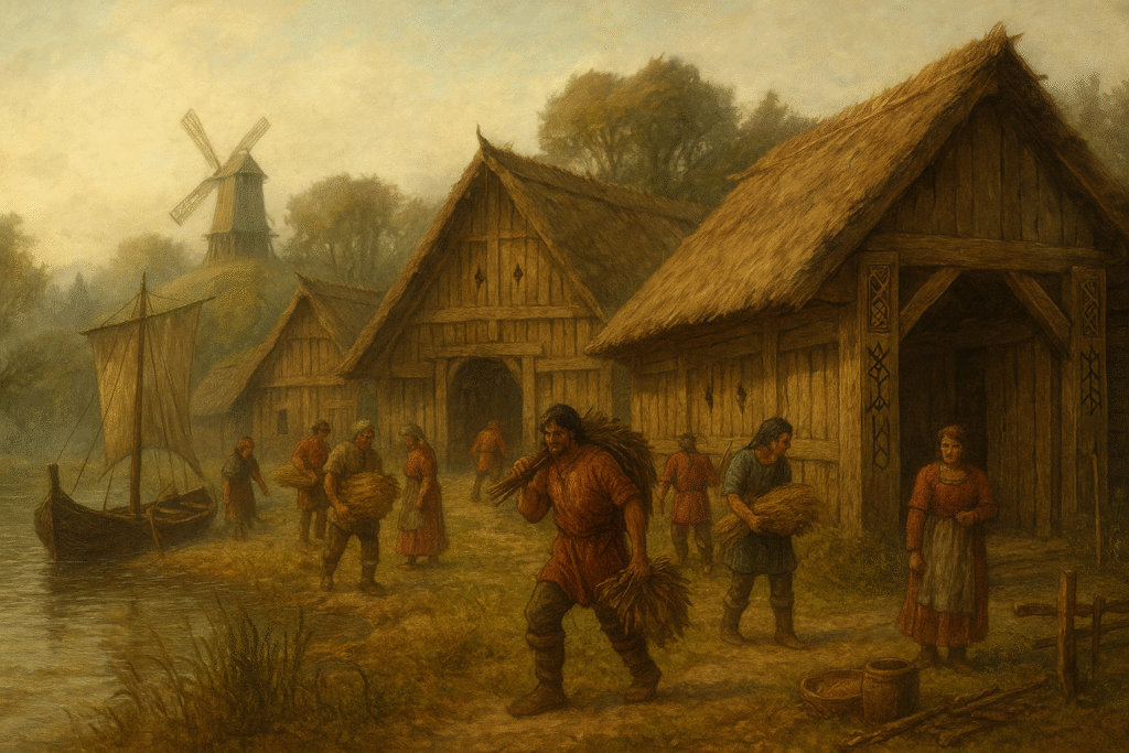 Their first major settlement on Gildraen’s shore was Hasklon, set on the seam between fen-carr and drier ground. Then, it was a thriving place: a great timber hall with arching double doors, a wooden windmill groaning on the rise, boats moored by the riverbank. The carr was generous — fish, fowl, and firewood in plenty — and the Hax’s skill with timber made their settlement swift and stout.